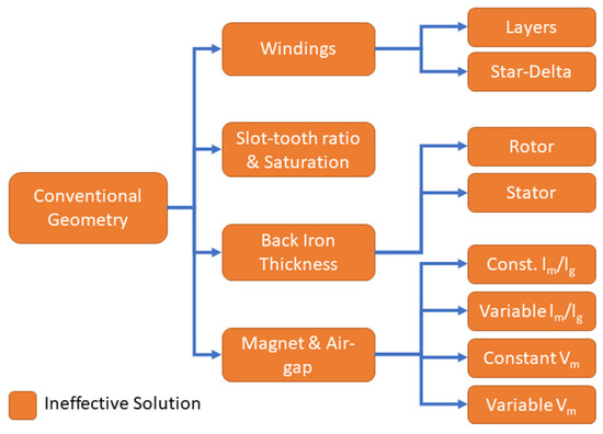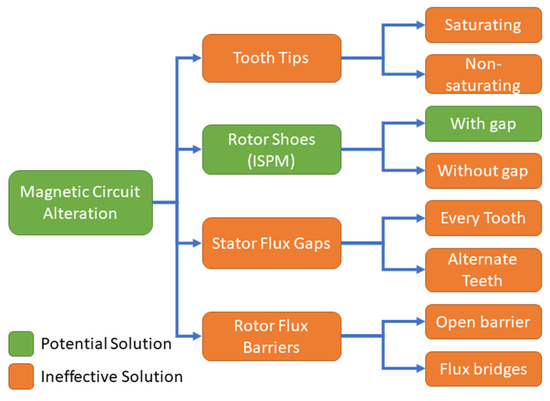 It is clear that it is not possible to design a 3 MW FSCW machine with conventional geometry to achieve a saliency ratio of 1.2 without a substantial reduction in torque performance. Therefore, this section looks at a range of methods to alter the magnetic circuit of the 3 MW machine to increase the saliency ratio. A breakdown of this investigation can be seen in Figure 19.