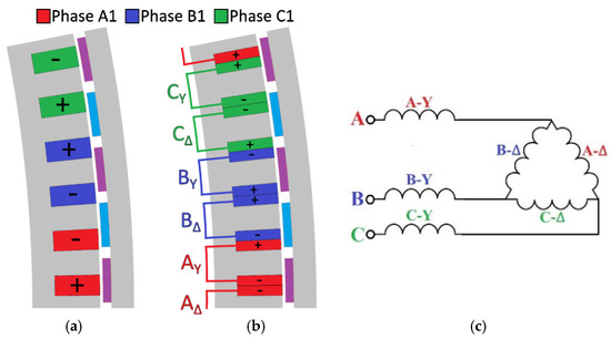 Alternative windings of 192s/160p 3-phase machine. (a) Single-layer windings, (b) star–delta double-layer windings, and (c) star–delta winding connection.