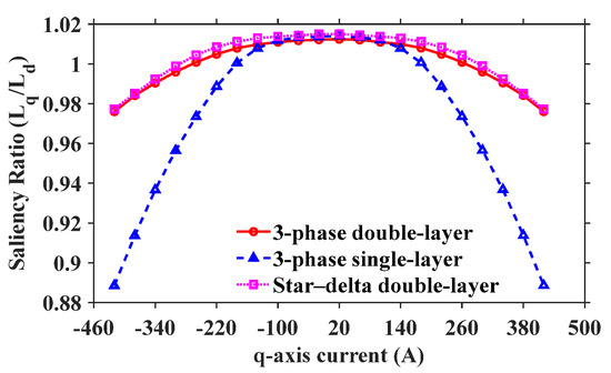 It is clear that altering the winding connection will not lead to an increase in the saliency ratio. The star–delta connection is able to improve the saliency ratio by 0.3% for low q-axis currents, but this is much too small to yield a tangible difference for sensorless control. Furthermore, this increase diminishes at high q-axis currents. The saliency ratio of the single-layer windings is within 0.1% of the double-layer windings for low q-axis currents and then drops substantially at higher currents. As a single-layer winding has twice the number of turns wound around an individual tooth when compared with a double-layer winding, this is an expected result. At higher q-axis currents, the teeth in the single-layer-wound machine saturate much more quickly, and there is a sharp reduction in saliency ratio owing to the reduction in q-axis inductance. It can be concluded that the winding connection cannot be used to improve the saliency ratio of the proposed FSCW machine.