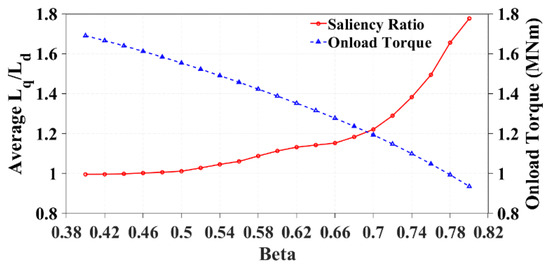 It has been evidenced in Section 2.2 that the saliency of the higher-spp machines comes from the saturation of flux within the stator teeth. Thus, it stands to reason that the simplest way to improve the saliency ratio of the 192s/160p machine is to adjust the slot–tooth ratio, i.e., β. However, by increasing the tooth saturation in this manner, it is expected that there will be a substantial reduction in torque performance. OPERA 2D was used to run a full q-axis sweep for a range of β values and compare them with the resulting torque performance of the machine. The results of this study can be seen in Figure 15.