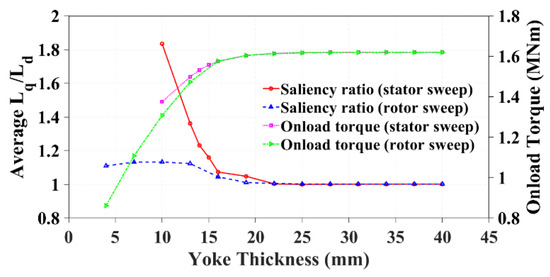 Saliency ratio and onload torque with varying yoke thickness.