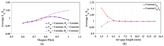 Magnet and air-gap dimension impact on saliency ratio. (a) Saliency ratio versus magnet pole arc and (b) saliency ratio versus air-gap length.