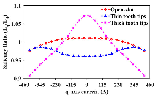 In [10], the tooth tips are designed such that they cause a high level of flux saturation, thus reducing q-axis inductance. Although this method reduces the saliency ratio, the key parameter for sensorless control is the difference between d- and q-axis inductances. So, even with a q-axis inductance lower than the d-axis inductance, a saliency inverse can be applied that yields a machine with an inversed saliency ratio of 1.2. In this section, two types of tooth tips are briefly studied: those that overly saturate the q-axis flux and those that do not cause excessive flux saturation. The PM flux saturation within both types of teeth investigated can be seen in Figure 21, with the results of the investigation given in Figure 22.