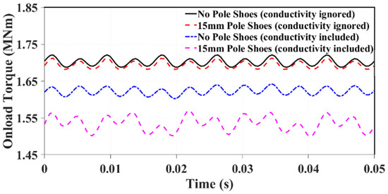 It is unfortunate that the inclusion of eddy currents drastically reduces the effectiveness of the rotor shoes when considering electromagnetic performance. With no material conductivity, the average torque of the 192s/160p machine with 15 mm pole shoes is only 0.5% less than the conventional 192s/160p machine. With conductivity included in the model, this difference is increased to 5.4%. This is not an acceptable reduction in torque performance; however, with optimization, this reduction could hopefully be minimized, and this is what is considered in Section 5. In addition, it is worth noting that this study was based on solid rotor iron core; if laminated iron core (with increased manufacturing complexity) was used, the rotor eddy current loss would be significantly reduced.