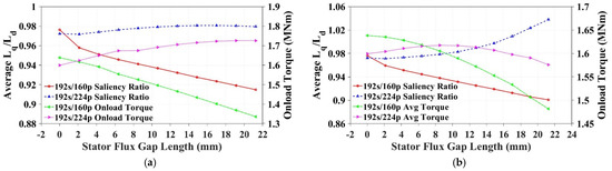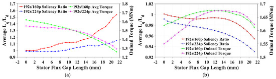 For the case of constant copper area, the increasing flux gap width serves to increase the saliency ratio of both the 192s/160p and 192s/224p machines, though the rate of increase is much higher for the 160-pole machine. This can be attributed to the reduction in tooth area and therefore increase in main flux saturation that has already been seen in Section 3.2. Although an increase in saliency ratio is achieved, the reduction in onload torque is once again too large to be considered a viable solution. For the scenario with constant tooth area, there appears to be a saliency inverse effect in both the 192s/160p and 192s/224p machines with increasing flux gap width in addition to an increase in onload torque. This phenomenon has been investigated in [18], where the flux gaps in C-core segments serve to initially increase the fundamental flux linkage before they become too wide and cause flux defocusing. By increasing the fundamental flux linkage, the d-axis inductance is increased in addition to the onload torque, resulting in a decrease in saliency ratio. However, even with the most extreme case observed in the 192s/224p machine, the resulting inversed saliency ratio Ld/Lq is 1.09, which is still not enough for sensorless control. While the impact of flux focusing on torque performance is an interesting avenue for research, it is not the main focus of this work and so will not be pursued further. The results for the same saliency ratio sweep with increasing flux gap width in alternate stator teeth and single-layer windings can be seen for the constant copper and constant tooth width scenarios in Figure 28.