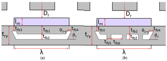 Flux barrier designs and parameters for optimization. (a) Open flux barrier—Study 1, and (b) flux barrier with bridges—Study 2.