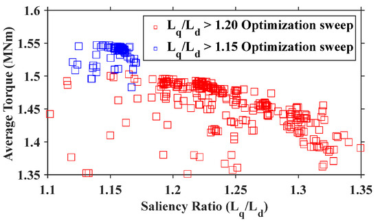JMAG’s optimization suite was used for a 192s/160p three-phase machine to try and maintain a high torque performance while simultaneously achieving a saliency ratio of 1.2. After this sweep, a few outlier designs demonstrated reasonable torque capability for a saliency ratio of 1.15. Thus, a second sweep was carried out with updated parameters close to these designs and a saliency ratio objective of 1.15. The optimization parameters for these sweeps can be seen in Table 5, and the results for both optimization studies can be seen in Figure 31.