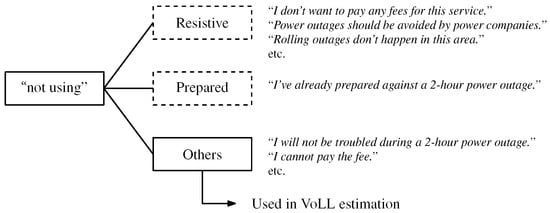 When the respondent chooses “Others”, concrete reasons are written in a blank space. Figure 2 shows the categorization of the “not using” answers according to their reasons. Resistive answers demonstrate a payment rejection not for economic reasons but discontent with hypothetical situations or payment methods. The third and fourth reasons are considered resistive. Free answers can be resistive when they do not demonstrate economic reasons. The first reason is not resistive, but it demonstrates that respondents have already paid for equipment to prevent outages. It can cause underestimation in terms of WTP to prevent outages. Thus, these answers are excluded from VoLL estimation. Answers using the second reason and part of the freeform answers can be included in the estimation.
