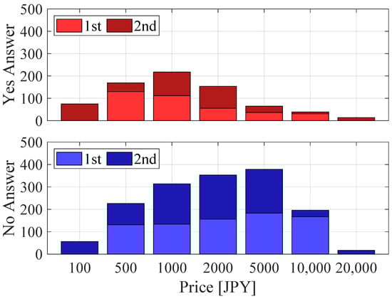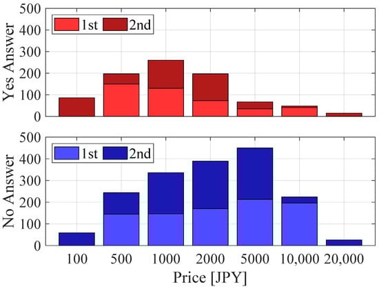 The survey inquires about WTP using the double-bounded dichotomous method []. The respondents answered twice whether or not they would pay the presented price. After the first answer, the same question is asked again but with a different price. The second presented price depends on the first answer. It is higher than the first one when the first answer is “willing to pay” (yes) and is lower when the first answer is “not willing to pay” (no). Figure 1 shows the options for the prices presented. The first price is chosen randomly. It is the same in both outage cases and for each respondent. The two answers narrow the range of respondents’ WTP (e.g., the first price is 500 JPY, and the respondent answers yes and then no; the WTP is from JPY 500 to JPY 1000).