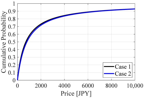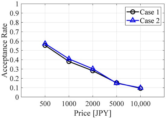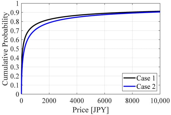 Next, we applied the logit model to the survey results. Figure 6 and Figure 7 show the distribution function of the acceptance rate from the logit model, excluding and including the “not using” answers, respectively. The plots show that the rate of WTP is lower than T []. The acceptance rate in Case 2 is lower than in Case 1 at the same price. Their difference is less than 5% points. Excluding the “not using” answers shifts the distributions to the left. Table 1 and Table 2 show the parameters in the logit model and the median WTP value when excluding and including the “not using” answers, respectively. The coefficient of the prices is negative and significant in all cases. This means that fewer people accept higher prices to avoid outages. The median of WTP is JPY 700–800 when excluding the “not using” answers. This matches the result from the acceptance rate curve (Figure 5). The median WTP when including the “not using” answers is one-seventh lower than when excluding them because around 25% of the valid answers are “not using”.