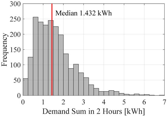 First, this paper uses the actual demand in 70 households to calculate the summed demand for 2 h. Figure 8 shows the histogram of the demand sum for 2 h. The time range to calculate the sum is 14:00–16:00 in August. Thus, 31 data per household are included in the histogram, and there are 70 × 31 = 2170 in total. The median of the demand sums is kWh.