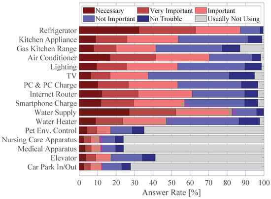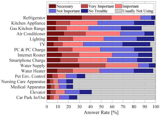 The answers regarding the importance of loads in Cases 1 and 2 are shown in Figure 9 and Figure 10, respectively. The most important loads are refrigerators and water supplies. Around 80% of the respondents answered they were necessary, very important, or important. The second-most important load is air conditioners. Around 70% of the respondents answered that it was necessary, very important, or important. In contrast, most respondents did not regularly use environmental control for pets, nursing care and medical apparatus, elevators, and car parking. The result demonstrates that nursing care and medical apparatus are not so important.