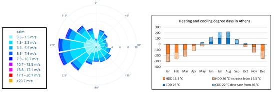 A wind rose, heating degree day, and cooling degree day profiles of Athens.