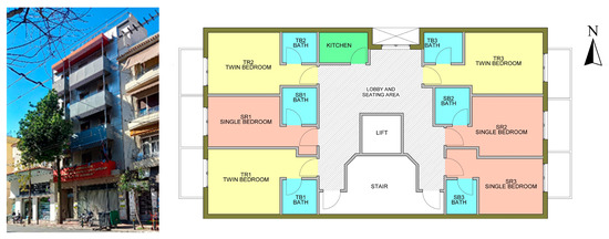 The case study building in Athens is located in a very dense urban texture within a well-defined urban canyon street. It is a five-story residential building, and it is highly representative of the low-rise multi-apartment buildings that were built during the 1930s. It was renovated in 2005 by adding rooftop insulation, installation of double-glazed aluminum windows to minimize thermal losses, and the replacement of outdated lighting with LED lamps. It is used as a hostel for homeless people and houses support staff, with a maximum capacity of 60 occupants. The total floor area is 1080 m2, and it has a ground floor, 5 stories, and a basement. It is located in Patission Street, which is a long street surrounded by similar height buildings starting from the center of Athens and extending to the north. The building is located about 3 km from the center of Athens (Omonia Square). A typical floor plan and an external view of the building are presented in Figure 3.