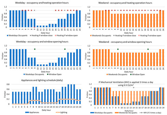 The building schedules (occupancy fraction, appliance and lighting usage, etc.) for a typical residential apartment, as recommended in the BSEN 16798 [26], were used in this study. Figure 4 presents the schedules used; 0 represents no activities, and 1 represents fully operated or active for one hour. According to the occupancy for weekdays and weekends, the heating hours, window opening hours, and mechanical ventilation time were applied. As the climate of Athens needs both active heating and cooling, either system were considered to operate if the indoor temperature was lower than 20 °C or higher than 26 °C [26]. The heating schedule was run from 05:00 to 23:00 except window opening hours; heating was turned off during the weekdays considering the lower occupancy. The cooling schedule was run according to occupant presence. Two different window-opening scenarios were considered in this work. One was that the window-opening time was proposed for two hours a day (morning and evening), and the other was to open the window during occupied hours if the indoor temperature was above 22 °C.