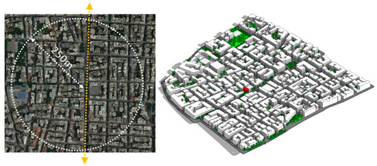 Autodesk Revit was used to generate the required building information for the UWG based on the urban area around the case study building, as shown in Figure 6 (left). Based on this area in Athens, a 3D model was created over an area of about 250 m in length, as suggested for local urban climate studies [36,37]. The case study building is located on the road (the yellow arrow shown in Figure 6), where the urban canyon wind was to be calculated. The topography of the site was modeled according to its location above sea level, where the south is lower than the north. The buildings were represented in the Revit massing models that allow for calculating the façade and floor areas of the site and average building height for the UWG program. The building types were defined for each 3D model that allows calculating the energy consumption for residential, primary, and secondary schools; retail shops; hotels; restaurants; supermarkets, etc. The building density, the urban buildings’ vertical-to-horizontal ratio, and the green area coverage were then calculated through the Revit area scheme. Evergreen trees were considered for the vegetation growing seasons. The massing models of urban buildings for the selected site are shown in Figure 6. After the UWG’s.xlsm files and other source files were co-simulated using MATLAB, two urban weather files for current and future scenarios were obtained. Table 2 presents the input values calculated.