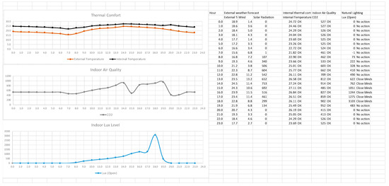 The day before the intervention (late in the evening), hourly forecast data were obtained using Open Meteo [45]. These included forecast hourly data for external temperature, wind speed, and global solar radiation, and they were input into the Excel tool. The Excel tool was run, and the optimum operation for windows and blinds was derived and sent to the building occupants via email. A screenshot of the simulation results is shown in Figure 8. This shows graphically the achievable air temperature, CO2, and natural lighting levels in the space according to Scenario 3 for window opening, which is two hours during the day (one in the morning and one in the afternoon) and during the night from 20:00 until 8:00. It indicates that thermal comfort and IAQ (using CO2 as the indicator) were satisfactory. It also shows how to use the shading (blinds closed between 13:00 and 18:00) to avoid high natural lighting levels, which can cause discomfort.