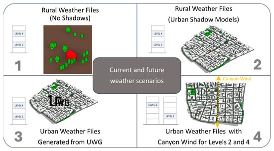 DTM simulations were carried out as described in Section 2.2. Data obtained from the building were used to define inputs for the EnergyPlus model, such as construction, schedules, and internal heat gains, which were supplemented by values from BSEN 16798-1 [26] when data were not available, as presented in Section 2.1. Figure 9 shows the four simulations performed. The first set of simulations were carried out using rural weather files with no overshadowing. The second set also used rural weather files with adjacent buildings in place to include overshadowing. The third set of simulations used urban weather files, as morphed using the Urban Weather Generator, including overshadowing. Finally, the fourth set of simulations used the urban weather files with wind speed corrections for the urban canyon and including overshadowing. The four sets of simulations were performed using current and future weather files, and the results were extracted for two levels in the building: Level 2 representing the lower floor, and Level 4 representing the higher floor.