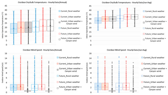 The differences between the various weather files are compared in Figure 10. The comparison of the urban weather files with typical weather files showed, as expected, higher temperatures in the urban environment. This is well documented in the literature and has been reported by many studies and review papers (e.g., [46,47]). The results also show that the air temperature increases in future weather conditions, but the annual mean temperatures were lower than 21 °C in all scenarios. However, when the temperature values were assessed for the summer period only, a significant temperature increment could be observed in future weather conditions, reaching its summer average temperature above 31 °C, which will indicate that mechanically assisted cooling might be required during these months for internal thermal comfort. The analysis of wind speeds shows that it reduces significantly within the urban canyon. The average urban canyon wind speed, generated for Level 4, which is located 15 m above the ground level, was as low as 1.5 m/s and mostly still throughout the year. That implies decreasing natural ventilation efficacy for cooling in this location, which can only be predicted if the urban canyon modification is included in the weather files. It also changes the infiltration rate, which would affect heating and cooling demand.