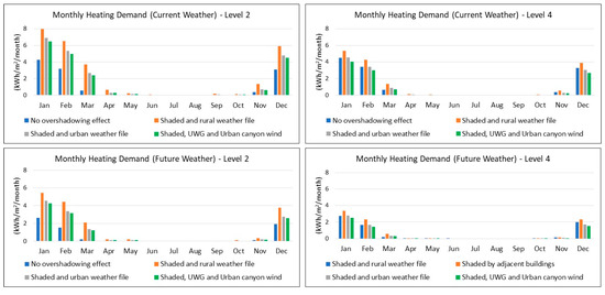 Figure 12 shows that heating demand was mainly from December to March due to the cold season in Athens. The heating demand of the building placed in the open terrain without adjacent buildings was less than the urban building because of the useful solar gains in a climate with relatively high solar radiation, even during the winter months. Therefore, simulating overshadowing is important as it would affect (increase) the heating demand significantly in all cases. As expected, using urban temperatures and future weather would reduce the heating demand because of the increase in outdoor air temperatures. Due to the effect of the urban canyon wind, the heating demand could be reduced because infiltration will be lower, reducing the impact of external cold air. At a building level, the heating demand of Level 2 is higher than Level 4 because of the overshadowing effect affecting lower floors more. Overshadowing seems to have a higher impact than infiltration on lower floors, which would have reduced heating demand because of lower wind speeds near the ground.