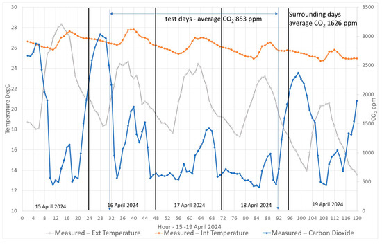 The predictions of the climate correlation model were compared with measured data in the building. A Hobo MX CO2 logger [49] was installed in one of the bedrooms for which the occupants were willing to take part in the study. The logger measured air temperature and CO2 in 30 min intervals. Figure 14 presents the measured data in the bedroom during the two days of the test and the surrounding days. It can be seen clearly that the CO2 level was much lower during the test days, indicating improved IAQ through ventilation. The average CO2 level was 853 ppm during the test days in comparison to 1626 ppm during the two surrounding days. The temperature trace also showed that internal thermal comfort was acceptable despite opening the window at night and the weather becoming a bit colder. The occupants seemed to stay in their room during the afternoon, and, in hindsight, opening the window in the afternoon for more than one hour should have been recommended. Nevertheless, the CO2 levels are acceptable, especially on the second afternoon when the window was opened for one hour as recommended (18 April).