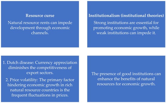 Overall, uncertainties regarding the direct economic impact of resource abundance led several authors to explore a potential hidden mechanism through which natural resources could influence economic growth. While the macroeconomic perspective focused on issues like “Dutch disease” and price fluctuations, an alternative approach emerged, highlighting institutional deficiencies as the primary barrier to growth in resource-rich economies. It is crucial to distinguish between the two branches of thought within the institutional framework. One branch, rooted in the “resource curse” theory, views natural resource abundance as a driver of institutional decay and corruption among the ruling elite, ultimately hindering economic growth. The other branch, known as “institutionalism”, also underscores the importance of institutions, but posits a different causal relationship: countries with abundant natural resources are not inherently cursed with weak institutions, but rather weak institutions themselves impede economic growth. To illustrate these perspectives on resource economics, we present a visual representation shown in Figure 1 [24] (Kaznacheev, 2013).