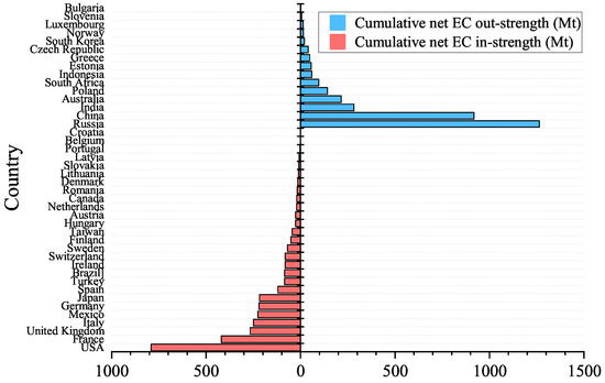 Cumulative net out-strength and cumulative net in-strength for 42 countries/regions in 2013–2022.
