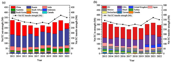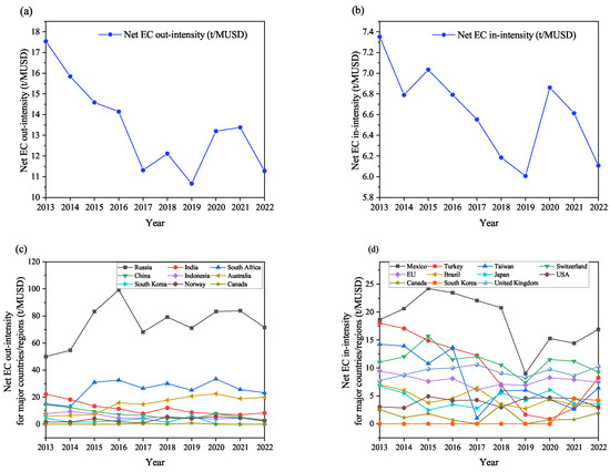 Additionally, to evaluate the net transfers independent of economic scale, the trends of net out-intensity and net in-intensity are depicted in Figure 3a,b. Both exhibit a declining pattern, indicating that global economic growth surpasses EC transfers. The net out-intensity and net in-intensity can be calculated using Equations (7) and (8). As illustrated in Figure 3c, throughout the study period, Russia and South Africa show relatively high net out-intensity. As upstream countries in the supply chain, on one hand, they should take partial responsibility for the significant carbon emissions generated during their production processes. On the other hand, the carbon emissions from the production of high-carbon-emission products should be apportioned to the downstream consuming countries. On the net inflow side (as seen in Figure 3d), Mexico and Switzerland have higher net in-intensity due to their dependence on importing -rich products. They transfer their own carbon emissions to upstream producing countries through imports.