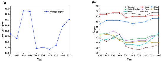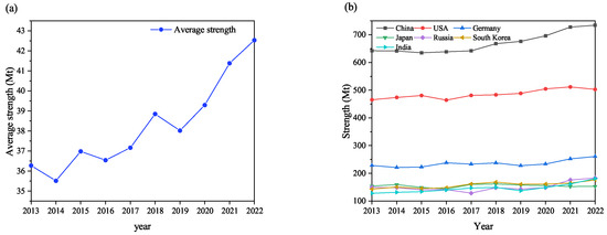 According to Equation (5), the average degree of the global -transfer network and the degree centrality of the main countries/regions are evaluated. The evolution trend is shown in Figure 4. In 2013, with the initiation of negotiations for the largest-scale free trade agreement in history, many countries/regions became more actively involved in the global supply chain, resulting in a rising trend in the network’s average degree, which peaked at 11.925 in 2015, as depicted in Figure 4a. However, following the full implementation of the “Paris Agreement”, countries/regions began adopting stricter emission-reduction measures, leading to significant restrictions on transfers. Consequently, the degree centrality of major countries/regions declined sharply, accompanied by a substantial drop in the network’s average degree. Since 2017, both the average degree and degree centrality of major countries/regions have experienced a steady upward trend. This resurgence is due to global governments implementing extensive measures to stimulate the economy after the financial crisis, fostering a rebound in global carbon supply chain involvement until 2017. According to Equation (6), the average strength of the global -transfer network and the strength centrality of the main countries/regions are evaluated. The evolution trend is shown in Figure 5. It reveals an overall increase in average strength, indicating that although interconnectivity between countries/regions has diminished since 2015 (reflecting a drop in average degree), the strength of their interactions has risen. Particularly from 2017 onward, robust global economic growth boosted resource flow efficiency, driving a marked increase in both average degree and strength in subsequent years.