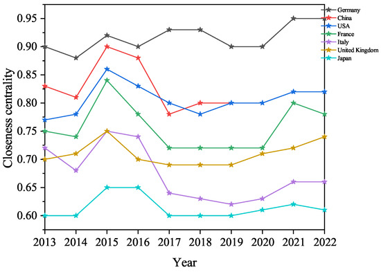 According to Equation (9), the metrics for the top seven countries/regions based on closeness centrality throughout the study period are presented in Figure 6. It is evident that, since 2013, Germany, China, USA, France, Italy, United Kingdom, and Japan have consistently held dominant positions in closeness centrality, highlighting their higher likelihood of transfers with other economies. It is due to their high -transfer efficiency with other economies that these countries are important drivers for the implementation of carbon-emission-control and -management policies.