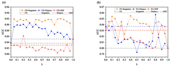 Prediction accuracy ( value) based on similarity indicators as a function of parameter . (a) Comparative analysis of hybrid indicators CN+Integration, CN+Distance and CN+GDP with single attribute indicators, (b) comparative analysis of hybrid indicators PA+Integration, PA+Distance and PA+GDP with single attribute indicators.