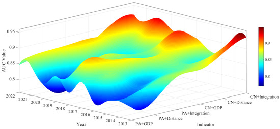Furthermore, the accuracy of link prediction utilizing the six hybrid indicators and the corresponding parameter is computed for the global -transfer network in 2022. The enhancement in in comparison to single similarity indicators is illustrated in Table 2. It is evident that the hybrid indicators, which coupling both exogenous and endogenous attribute information, achieve an average increase of 5.47% in values relative to single similarity indicators. Moreover, the indicator exhibits superior prediction accuracy compared to the indicator, suggesting that defining common neighbors as a similarity indicator more closely with the structural characteristics of the -transfer networks. Additionally, among all similarity indicators, the hybrid indicator has the highest value, showing an improvement in prediction accuracy of 8.11% and 10.71% compared to the single similarity indicators representing endogenous and exogenous factors, respectively. Similar results are observed for other years, with the evolution of link prediction accuracy for the six hybrid indicators corresponding to the optimal parameters depicted in Figure 8. The deeper the red color, the higher the value, indicating greater prediction accuracy. Notably, from 2013 to 2022, the indicator is associated with the reddest hue, reflecting the algorithm’s optimal performance. This suggests that the evolution of the global -transfer network is influenced not only by the number of common partners, but also by the strength and levels of the countries/regions, as well as the geographical distance between them. Consequently, this paper selects the indicator for predicting potential -transfer links.