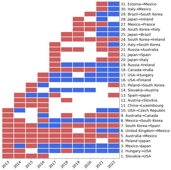 The ranking of the values for each pair of countries/regions in 2021 is presented in Figure 9. This assessment serves as a foundation for identifying potential flows from non-existent links. As illustrated in Figure 9, only a limited number of country/region pairs exhibit elevated values, highlighting the preferential characteristics of flows. Additionally, the results of the link prediction are compared with the actual flows to examine whether these potential links, characterized by high values, can be established in the future. Figure 10 displays the top 10 potential -transfer links based on the value for each year from 2013 to 2022. The positioning of the squares within the columns and rows corresponds to specific years and -transfer links, respectively. The red squares indicate the top 10 values for the respective -transfer links, while the blue squares represent actual -transfer links. White squares denote that the corresponding -transfer link does not currently exist and its value is not among the top 10. For instance, in the row corresponding to Mexico→Japan, a red square appears in 2013, indicating that this potential -transfer link was predicted for that year. A blue square appears in 2014, indicating that this country pair established an actual link in 2014. This reflects the fact that the country pair quickly established an actual link the year after it was first predicted as a potential -transfer link. Conversely, if a red square is present in the row for a potential link, but no subsequent blue squares appear, such as in the case of Slovakia→USA, this indicates that the predicted link did not materialize during the study period and is considered an invalid prediction. As observed in Figure 10, 22 out of 31 potential -transfer links were successfully predicted, resulting in a success rate exceeding 70%.