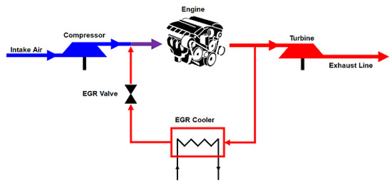 EGR consists of deflecting a fraction of the exhaust gas to the intake manifold to dilute the fresh air entering the cylinder. A typical system configuration is the high-pressure (HP) EGR. The exhaust gases are picked up before the turbine, and they are cooled and introduced in the intake system after the intercooler (in the low-pressure configuration, the sample point is after the turbine and the re-introduction point is upstream the compressor). A dedicated valve handles the amount of recirculating gas. In Figure 1, a scheme of the HP EGR is reported.
