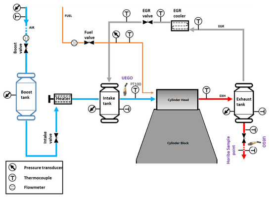 In Figure 2 is reported a scheme of the intake, exhaust, and EGR lines with the equipped sensors, and Figure 3 shows a picture of the SCE.