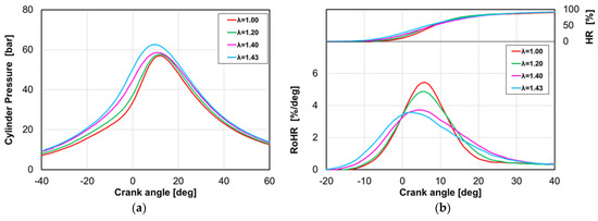 Figure 4 shows the in-cylinder pressure and RoHR curves for the cruise point as a function of lambda dilution. The lambda values shown in the graph legends represent the desired values. For clarity reasons, lambda steps of 0.2 are reported up to the most diluted point: this way, the differences are more easily noticeable.
