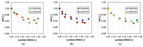 In Figure 6, the ISFC trends as a function of lambda values derived by the Horiba analyser (referred to as “Lambda MEXA [-]”) are reported. The curves are grouped for engine speed, and the values are normalized on the specific fuel consumption value of the non-diluted condition of each specific point.