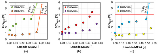COVIMEP versus lambda trends in the lean combustion campaign, regrouped by engine speed: (a) 1100, (b) 1200, (c) 1400.