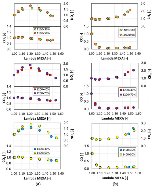 (a) CO2, NOx; (b) CO and unburned CH4 emissions collected by Horiba MEXA in lean lambda campaign.