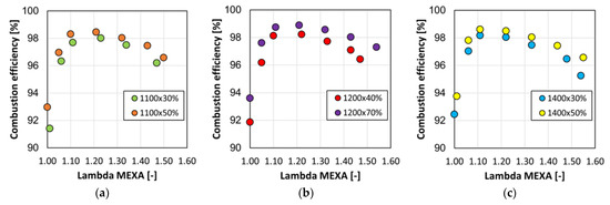 Combustion efficiency for the tested points in lean combustion, regrouped by engine speed: (a) 1100, (b) 1200, (c) 1400.