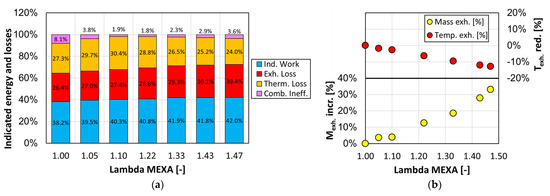 Figure 10a shows how the energy potentially obtainable from the ideal combustion of the injected fuel (considered as 100% for each individual point) is distributed between the losses (non-ideal combustion, heat losses, losses due to residual exhaust gas energy) and the indicated work obtained for the cruise point as λ progresses. The total potential energy was calculated by multiplying the mass of the fuel by its calorific value. The indicated work was calculated from IMEP and displacement. The residual energy of the exhaust gases is calculated using the following formula: