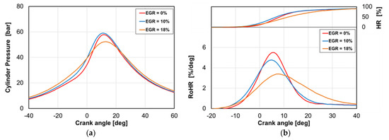 In Figure 11, the mean in-cylinder pressure cycles and RoHR traces are shown for the cruise point as the EGR ratio increases. EGR steps of 10% are reported for clarity reasons.