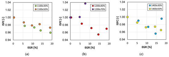 ISFC trends exhibited in the EGR campaign, regrouped by engine speed: (a) 1100, (b) 1200, (c) 1400.