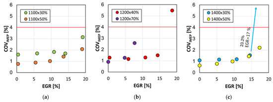 COVIMEP trends recorded in the EGR dilution campaign for all the tested points, regrouped by engine speed: (a) 1100, (b) 1200, (c) 1400. The red line refers to the acceptance threshold of COVIMEP.