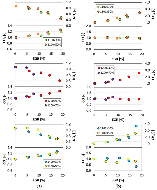 In Figure 8, the CO2, NOx, CO, and unburned CH4 emissions are shown. The emissions are normalized on the value provided in grams on kWh by the non-diluted condition of each specific point.