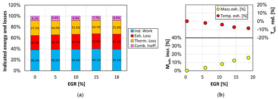 As presented in the lean combustion results section, Figure 15a quantifies the percentage contribution of each specific loss type to the total potential energy obtainable from the ideal combustion of the injected fuel, along with the indicated work acquired, as dilution progresses for the 1200 × 40% engine point. In this case, the gas mass used for calculating the residual energy in the exhaust gas considers the air, fuel, and EGR mass. This evaluation considers the engine as a control volume in which these three masses compose the whole trapped mass that undergoes the thermodynamic cycle. Moreover, the EGR flow sent back to the intake is cooled, losing most of the energy still available at the exhaust port, and equalizes its temperature with that of the fuel and air at the intake port. It would not be correct to exclude the EGR mass from the calculation even though it is recirculating, as its energy at the intake differs from that at the exhaust, and the residual energy would be underestimated. Figure 15b shows the trends for exhaust mass and temperature.