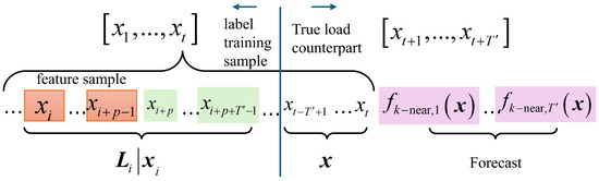 Referring to the above definition, let represent the number of neighborhood samples associated with the feature sample with the closest Euler distance to the input feature sample , represent the kth closest historical feature sample in the neighborhood of ; note that and represent the true load counterpart of at the j period, and then the load prediction value defined in this article is expressed as [13]: