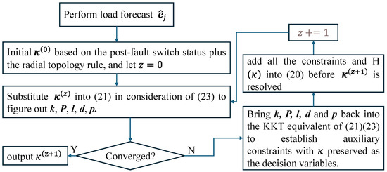 Without a loss of generality, represents the operating status of the branch switch between node m and node n at time t. represents the initial state of the switch after fault isolation. The set of nodes either without automatic switches or isolated due to a fault is represented by . Therefore, the switch status constraints should firstly be expressed as