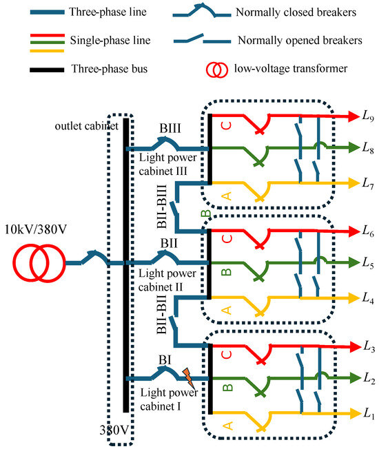 To avoid ambiguity with respect to the current research status of renewable energy penetrated distribution networks, it is first clarified that the LVPSA studied in this article refers to the traditional distribution (or service)-transformer-supplied radial 380 V power station area in the absence of any distributed energy resources. Such a topology prevails in most practical urban low-voltage distribution networks in China. Starting from the transformer, the downstream structure of the concerned LVPSAs is outlined in Figure 1 and explained as follows: outlet wires of the transformer are tapped through the outlet cabinet to the distribution box and then led out from the distribution box to the light-power cabinet generally residing in the building. Finally, the outlet wires of the light-power cabinet are designated phase by phase to the home through branch boxes. Note, each location of each box/cabinet forms a branch node. According to the operation and management requirements of the power grid department of China, distribution boxes are generally only equipped with knife switches with fuses. On the other hand, the other cabinets can be equipped with remote-controlled circuit breakers and monitoring communication units to perform the functions of “telemetry, remote signaling, and remote control” on demand. Furthermore, through integration with the intelligent fusion terminal and lightweight edge computing, advanced functions such as fault clearing, fault isolation, switching operations, etc., are enabled. Considering the above-mentioned software and hardware environment and data acquisition conditions of the LVPSAs, the LVPSA self-healing strategy devised in this paper is based on the following assumptions: