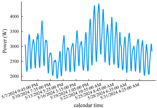 For the load forecast accuracy tests, we used intercepts of the monthly load curve of the 5-minute sampling interval in the “DEQK” area spanning from 12:00 a.m. 5 May 2024 to 1:50 a.m. 3 June 2024 in UTC time from the open-source database [22]. The load records with the same timestamp are averaged, and all the values are uniformly reduced by times to simulate a low-voltage single-phase load (a total of 8375 data points, as shown in Figure 6, which is used to verify the prediction accuracy of the fog computing load prediction method proposed in this article. Taking the lead time of 4 h as an example, that is, , other hyperparameter settings include , , initial weight , and . In order to simplify the explanation, the following algorithms participating in the comparison are named M1, M2, and M1 and M2, respectively. Among them, the M1 method represents the original k-neighborhood prediction method [13], the M2 method is the improved derivative, and M1 and M2 is the fog computing load prediction method.